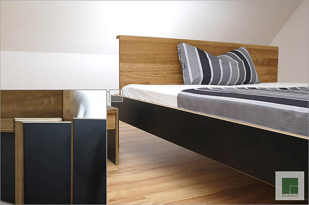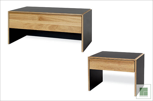 Die Oberfläche aus hochwertigem Schichtstoff harmoniert in besonderer Weise mit den in massiver Eiche ausgeführten Lehnen und Fronten der Nachttische.